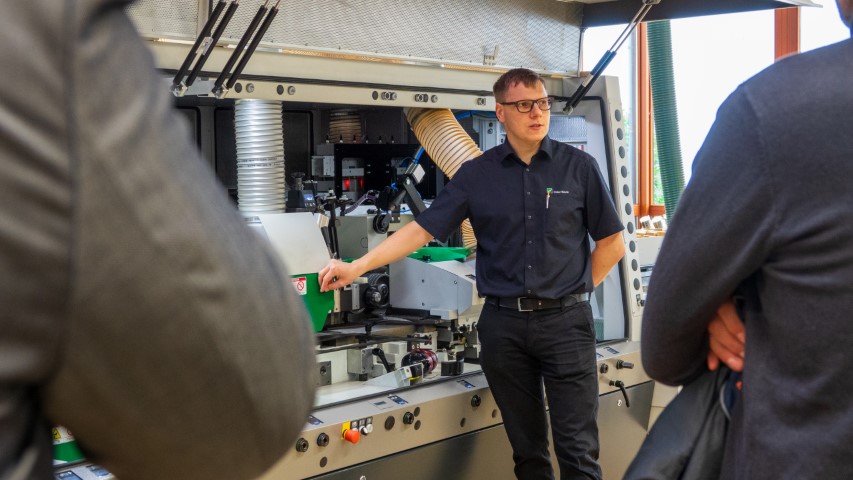 De 2de dag begon met een ontbijt, gevolgd door een kort ritje terug naar WEINIG. Deze dag stond in het teken van demonstraties en diepgaande inzichten. In Expo 1 werden deelnemers getrakteerd op een reeks demonstraties over schaven en profileren. De aftrap was op de WEINIG Cube 3, een plug-en-play vierzijdige schaafmachine. Daarna door naar de WEINIG Powermat 1500 met Powerlock waar o.a. profielen van olifanten, konijnen en egels werden geschaafd. Ondertussen gaf een technicus van WEINIG meer uitleg over de machines, drukstukken, messen, instelbaarheid, assen, omstellen, gebruiksgemak, laserlijnen en meer. De schaaf- en profileerdemonstraties werden afgesloten op de WEINIG Powermat 3000 3D waar de deelnemers achter het verschil kwamen tussen structuur schaven en 3D schaven.
