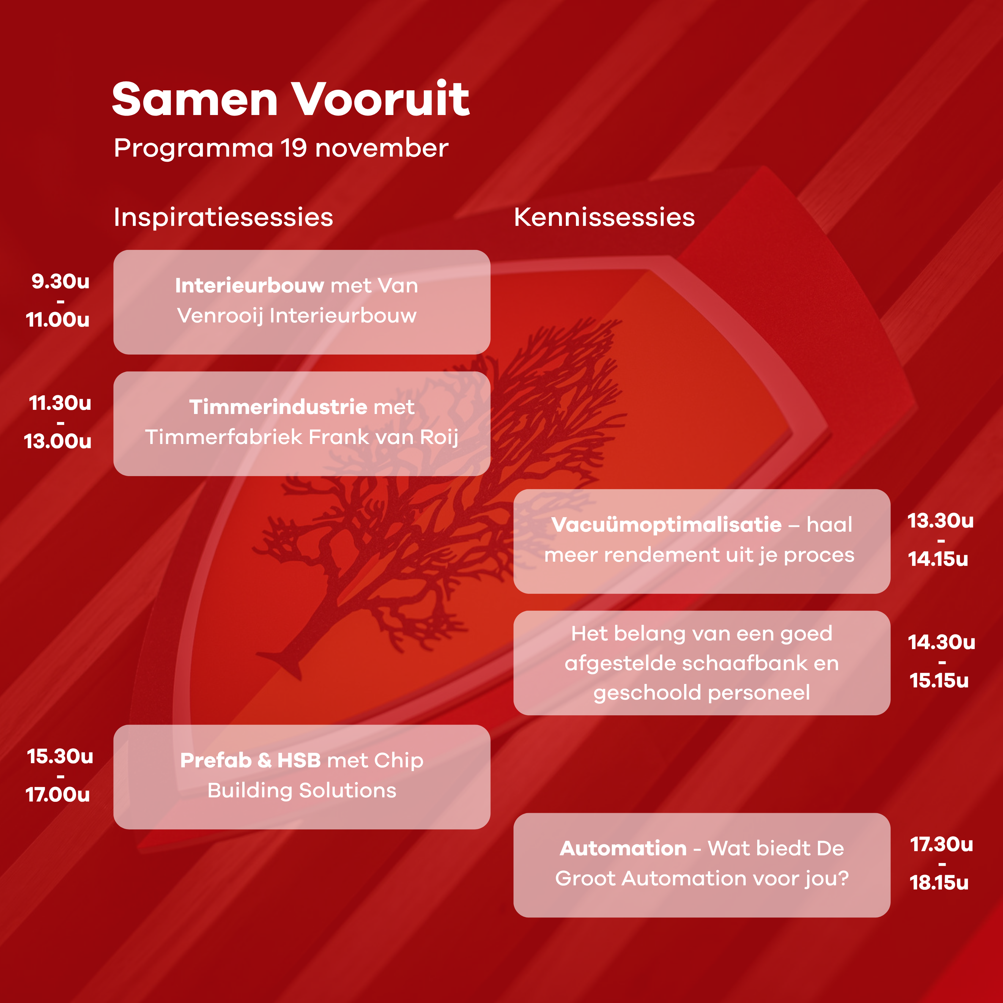 Daarnaast zijn er kennissessies over automatisering, vacuümoptimalisatie en rendement – met inzichten die je direct kunt toepassen in je eigen werkplaats.Woensdag 19 november