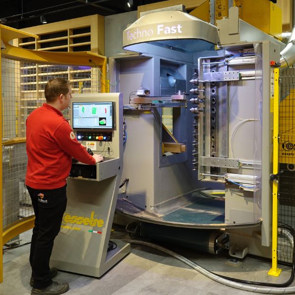 De Essetre Techno Fast staat opgesteld in onze showroom in Rosmalen. Je ziet hoe de machine werkt in de praktijk: van 3D-simulatie tot het bewerken van grote balken en elementen.